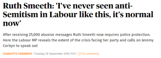 Smeeth has been one of the key figures in Labour arguing that under Jeremy Corbyn the party has faced a supposed “anti-semitism” crisis – and she has claimed to be one of the prime victims of anti-Jewish abuse inside Labour. She alleged in the British media that she had personally received some 25,000 abusive messages online, most of them via Twitter, in a few days in June 2016, during a spat over the Chakrabarti inquiry’s findings on anti-semitism and the Labour party.
