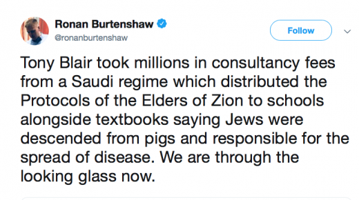 He objects to Labour members raising the issue of Israel when Jewish comrades want to talk about anti-semitism by noting that no one would think it acceptable to deflect the conversation to Saudi Arabia if Muslims sought to talk about Islamophobia.
