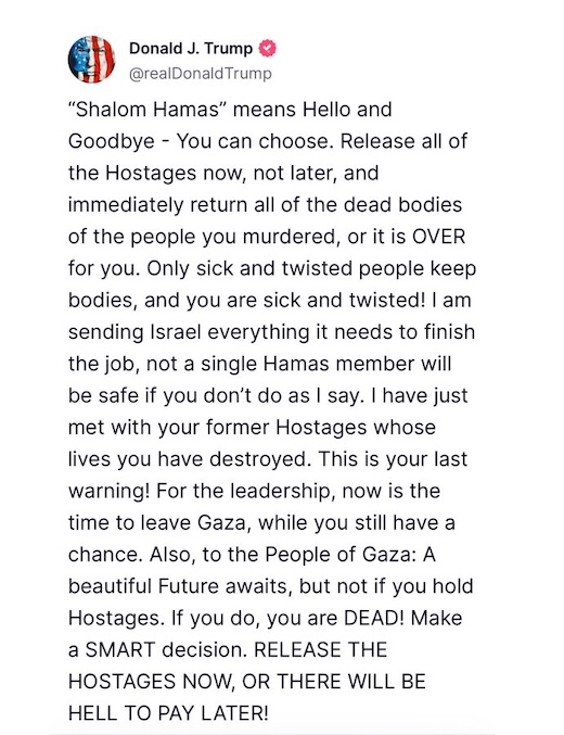 After all, Trump makes his own genocidal intent expressly clear in addressing “the people of Gaza” and telling them that they will all be “DEAD” if the Israeli captives aren’t handed over. Yet “the people of Gaza” have no control over whether the captives are released.
