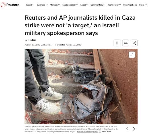 Reuters headline on the story – the only part that most people read – runs: Initial inquiry says Hamas camera was target of Israeli strike that killed journalists.