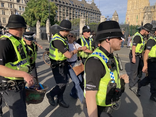 What I saw was a great deal of what the police are terming “verbal abuse”: that is, every time a group of 10 or so officers were dispatched to arrest one of the silent protesters sitting on the green in Parliament Square, many of them elderly or infirm, other protesters who were observing the proceedings would gather around the arresting officers and try to shame them.
